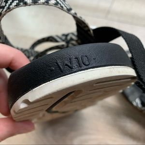 Strappy black and white Chacos! Used but lots of life left in these. I have many pairs of Chacos myself, they’re comfortable with good arch support. Perfect for casual wear or outdoor activities