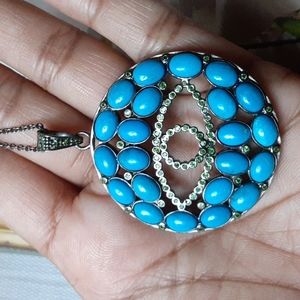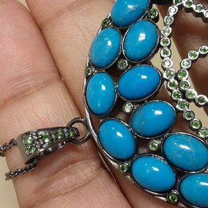 New, magnificent, unexpected combination of the stunning green of the Russian Diopside with the calming blue of these Sleeping Beauty Turquoise. Wow, seriously, sooooo beautiful, With the black Rhodium over the silver for a truly stunning look. This looks like true statement luxury. This comes with a chain. The evil eye pendant and chain you see is the one you get.
