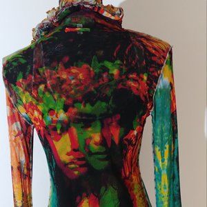 Iconic Jean-Paul Gaultier face print mesh top, Sheer mesh top with face print, Wide neckline, exposed seams, 1990's Jean-Paul Gaultier Maille with the label, used