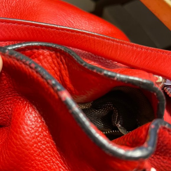 Cracks in the glaze of the border, peeling of leather pleats and floor studs