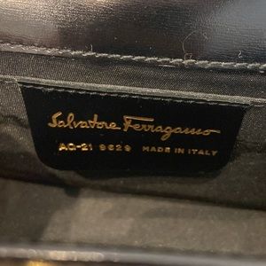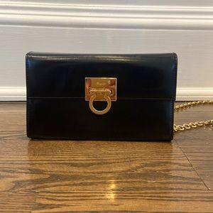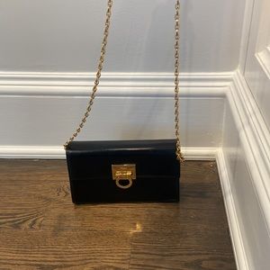 Salvatore Ferragamo black leather bag with gold hardware and gold messenger strap. Beautiful bag!! Gently used amazing condition!