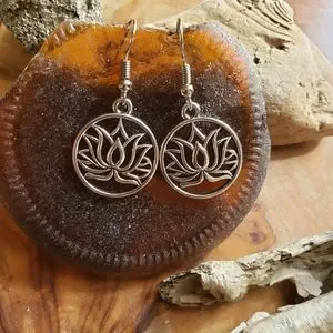 Dress up with these boho ethnic earrings feathering limited lace zen lotus charms. Silver tone with nickel free hooks. Great match for yoga outfits and meditation. I can ensure you that you can't find them anywhere online!