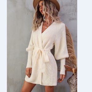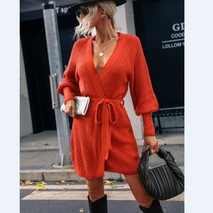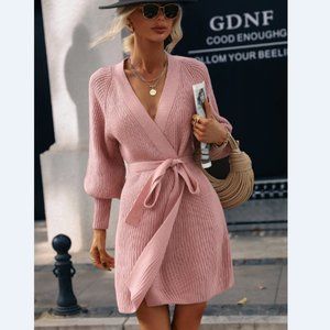 Rib-Knit Lantern Sleeve Belted Sweater Dress