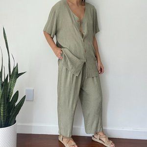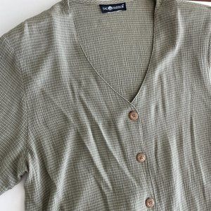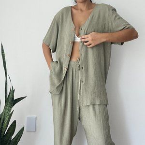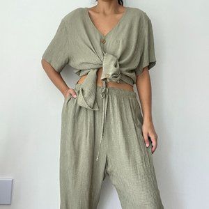 Soft olive green and cream white checked pattern, elastic waist with drawstring.