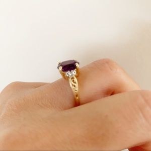 Excellent Condition. 14k Gold stamped band with Amethyst oval center stone with small diamonds on sides. Size 6