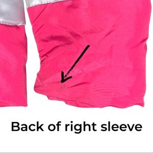 This is a fun coat with a few issues. The zippered hood is missing and there are a couple of spots with stains.