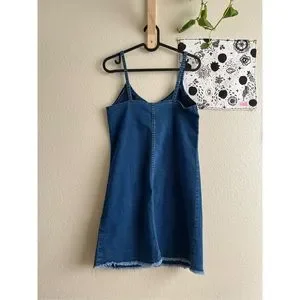 Cute jean mini with button down, spaghetti straps, and frayed hem, in great condition! Size M but fits like an S with stretch.