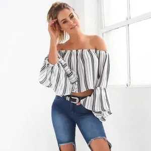 Striped Long Flared Sleeve Off Shoulder Cropped Blouse