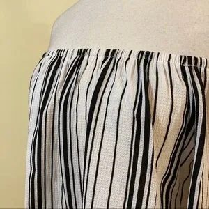 A soft, flowy, crepe blouse with vertical black and white stripes, an elastic off shoulder neckline, and long, flared bell sleeves.