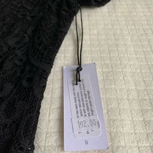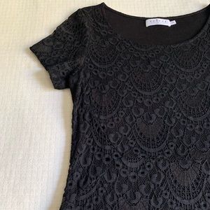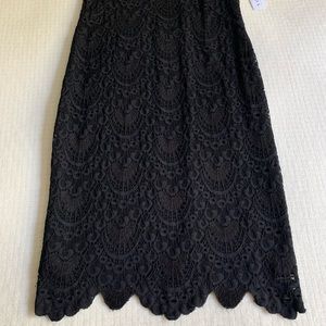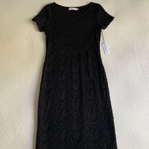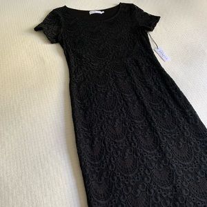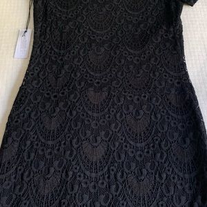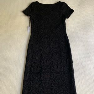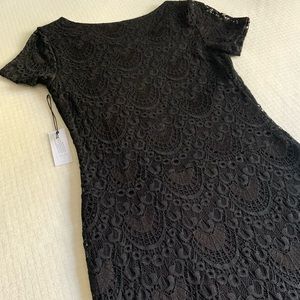 Exceptionally beautiful black lace stylish & chic dress from Velvet by Graham & Spencer. Sexy, stretchy and form fitting! Scoop neckline. Cap sleeves. Flattering waist and triangular side panel seams add visual interest. Intricate scalloped hemline falls nicely. 79% nylon, 13% rayon, 8% spandex. Fully lined in black 100% rayon. Size S. Measures 42” long with 16” bust with 6” sleeves. Never worn. Like new condition! NWT. HL:15
