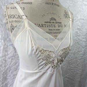 A white nylon full slip with butterfly lace detail at the bodice. The label reads, "Youth Form 100% Nylon Tricot". Tag Reads Size 34