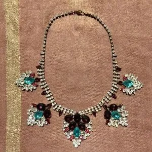 Purchased this in 2002 from a seller in Poland who said it was dead stock from an old crystal jewelry factory. Intended for a photo shoot, has been in storage. All stones are tight, bright with no discoloring. Working lobster claw clasp which has patina/tarnish. Backside shows visible sautering. Stones are deep purple, turquoise, pink, red and clear rhinestones. Measures 16 inches Heavy weight. Thanks for your interest, happy to answer any questions, Happy Poshing! 🎁 One of a kind, statement piece. Comes with gift box