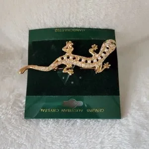 Description: Stunning Salamander Brooch Pendant. Goldtone base with Genuine Austrian clear Crystals and simulated mini pearls on body and tail with Green Crystals on eyes. No missing stones. 1 stone on head is darker than the others. Makes it unique!Very pretty statement piece. Perfect for pinning a scarf, or on a Wrap, Ruana, Coat or jacket.