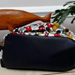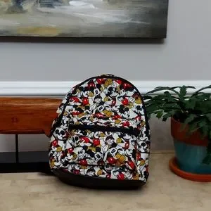Mini Disney backback featuring Mickey Mouse design pattern. Size is approximately 9.5" L x 5" W x 12" H. Shoulder straps are adjustable. Zipper compartments with front pocket. Great for Disney fans of all ages! Perfect for packing those necessary items for a day at the park, or just casual wear.