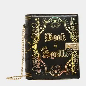 Get charmed by this Book of Love Spells handbag! Work your magic with iridescent foil detailing and a metal faux lock. This bag can live on your bookshelf when not out for a night on the town. Full zip-around closure, crossbody length strap, fits a large phone, and more! Item ships brand new in sealed package with tags. Includes a gold sequin puffed heart keychain