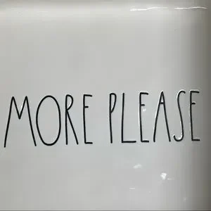 Dish is creamy white. "MORE PLEASE" is written in black large long letters II.