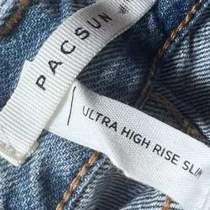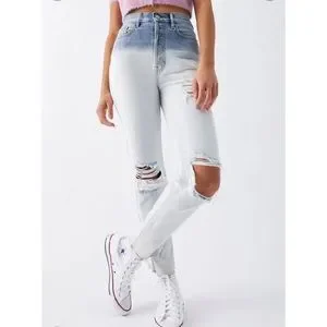 Pacsun Ultra High Waisted Distressed Slim Fit Jeans in Light Blue features a durable rigid fabric, and ab acid wash.