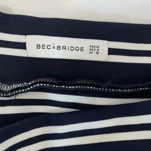 Bec & Bridge ponte dress styled in classic stripes. A wide neckline reveals the shoulders. Hidden back zip. Long sleeves. Unlined.
