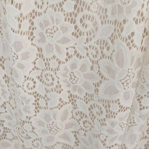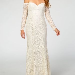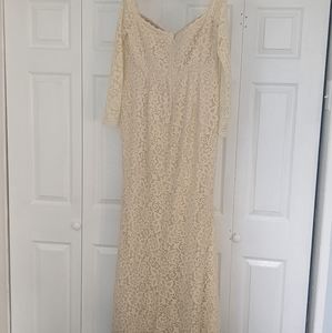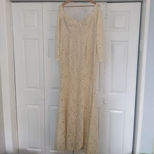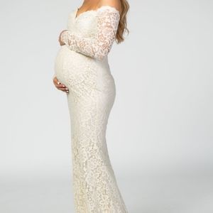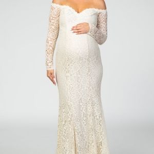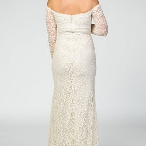 Beautiful lace off the shoulder gown that would look gorgeous in maternity pictures or to wear as a bride. Looks more cream/beige in real life than website photos suggest. Worn once for photoshoot and there are some loose threads around hem (see pictures)