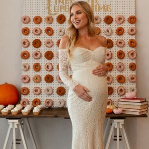 PinkBlush Beige Lace OffShoulder Long Sleeve Maternity Photoshoot or Bridal Gown