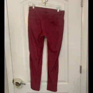 Maroon jeggings. All pockets functional. Small snag above back right pocket shown in photo 3. Strings from seam in photo 4. Small hole, can probably be sewn, below belt loop on back right side, shown in photo 5.