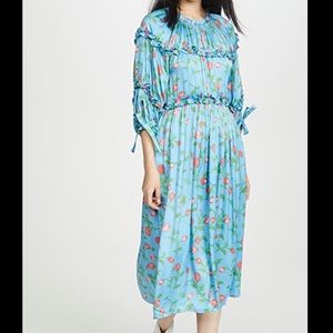hofmann copenhagen mirielle blue dress with flowers. size 34. good condition. ruffle neckline with 3/4 puff sleeves and ties. button keyhole at back. lightweight non stretch charmeuse. perfect for spring!!