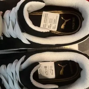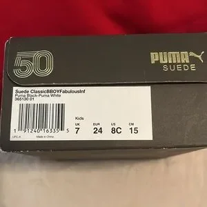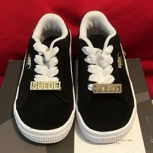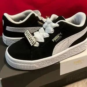 Black with white suede Adidas. Toddler size 8. New with box. Bought for grandson but did not fit. “Suede” detail is removable through laces. Awesome little pair of shoes.