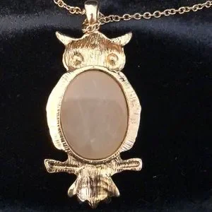 Gold toned chain & pendent necklace. 18 in chain with 3.5 in extension. Claw type closure. Owl is 2 in with rhinestone eyes and colored belly. Not sure if it’s stone.