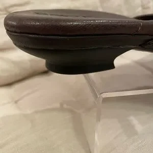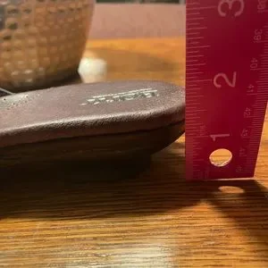 Never worn leather mules. Have been stored in dust bag (included). Heal is approximately 1-3/4”. From smoke- free home.
