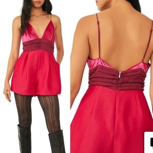 Brand NWOT Free People Skylie Saylor Romper, rich color blocking enlivens this night- out romper styled with a slinky strapped, velvety bodies. Size 6