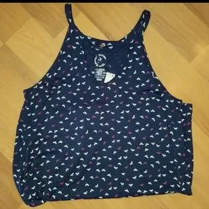 24/7 collection from Maurices, high neck, criss cross across chesr detail, flowy and figure flattering. Navy blue with all over butterfly print