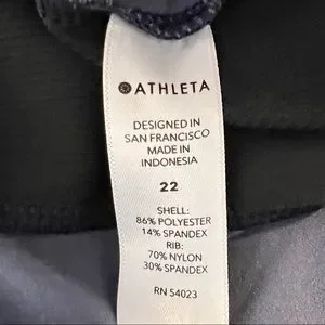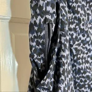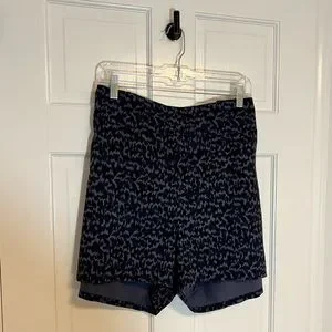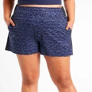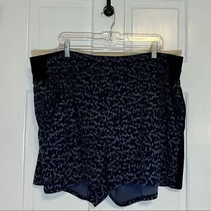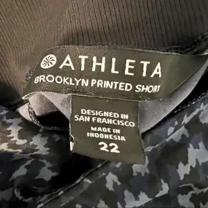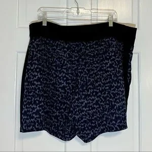 Athleta Brooklyn printed short. Black and blue almost abstract leopard print. 2 front pockets, one with additional zip compartment. 2 back zippered pockets. Semi-fitted, skims easily over the body with a mid-rise waistband. Athleta’s Comfortable Sculptek Rib
