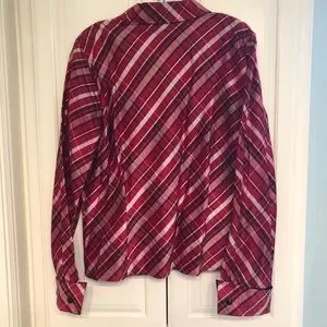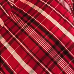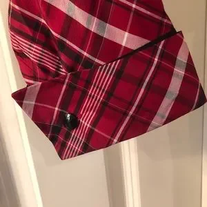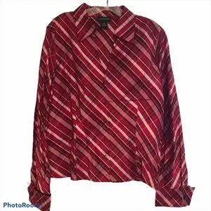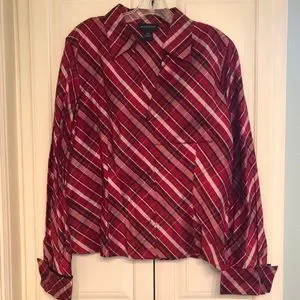 100% silk black, white and red plaid button up blouse with french style cuffs. Buttons are covered in silk. Perfect for a holiday party, banquet or even a day at work.