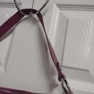 Purple leather with Zip exterior Pocket has Tassel attached. Soft leather rich smell.
