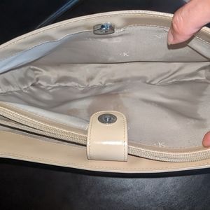 Well preserved Calvin Klein beige patent leather bag. It has 3 compartments. The lining has ink marks in places and generally shows wear. There's minimal damage to the exterior, just regular wear.