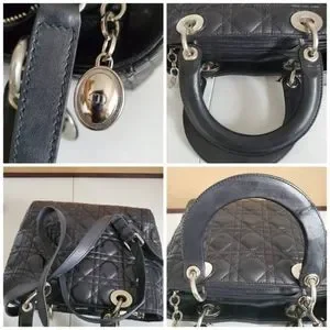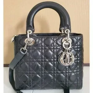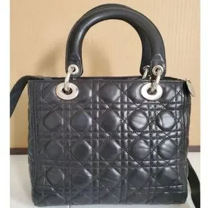 This authentic Christian Dior lambskin Cannage Lady Dior Bag is in it's good pre-owned condition, has sign of use. The exterior Lambskin leather shows scratches and creasing. The hardware shows scratches. Open to a beautiful clean leather interior. The strap is not CD . The original strap is missing.