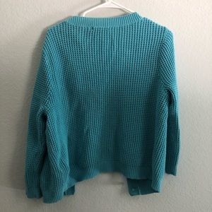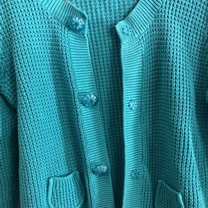 This sweater buttons all the way down to the waist. Cropped! Light weight and airy! The fancy flower snap buttons give it an elegant touch!