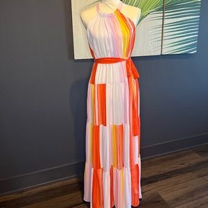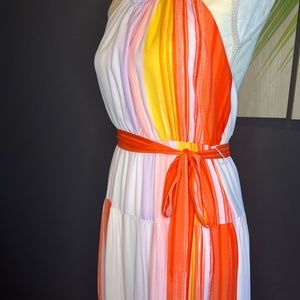 Dress to impress with this gorgeous Paradise Passion maxi dress featuring ultra lightweight breezy material patterned with tangerine, yellow and light pink hued stripes, a halter neckline, tieback closure, tie belt, hidden SIDE POCKETS, and a relaxed silhouette. Perfect paired with wedges for your warm night out or on vacation!