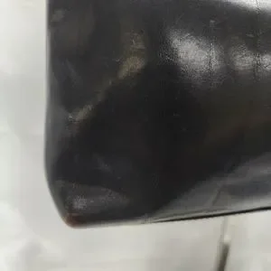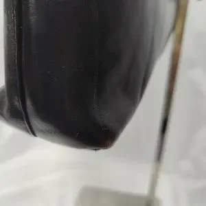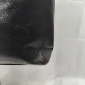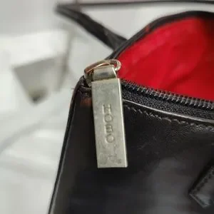 This Gorgeous Hobo Int Lola has an effect when you first see it. Black polished leather with brown marks from wear on handles and corners. These are not deep and only affect the color of the leather and make everything pop! Silver hardware with Hobo on the zipper pull. The interior has a few small holes in the otherwise perfect red cloth lining. Inside also contains a zipper pocket and Hobo Int. Patch.