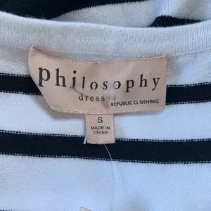 NWT white and black striped Philosophy bodycon dress, size small. 87% rayon/10% nylon/3% spandex. No rips, tears, or staining. All measurements are approximate.
