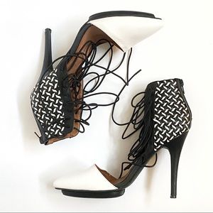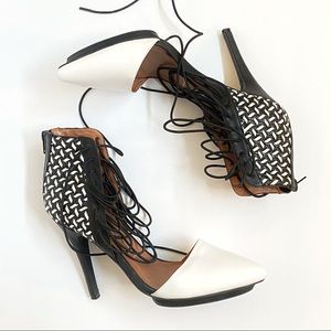 Jeffrey Campbell Roulette black white pointed toe lace up ankle open sides heels