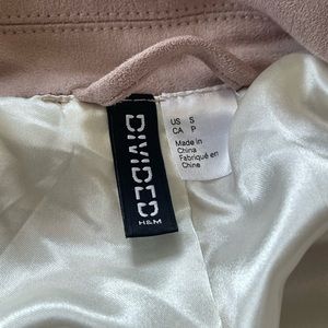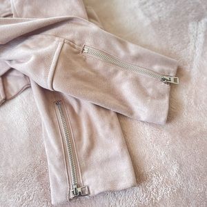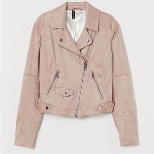 Biker jacket in soft imitation suede with a collar, decorative buttons on the lapels and a diagonal zip down the front. Long sleeves with a zip at the cuffs, zipped side pockets, a small flap pocket with a press-stud at the front and a decorative tab and button at the sides. Satin lining.