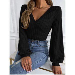 Black Lantern Sleeve V Neck Rib-knit Tee