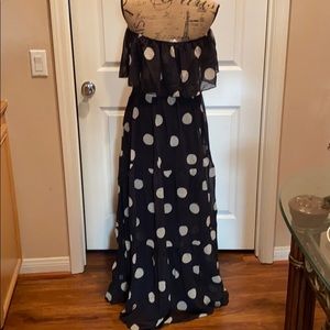 Black and Tan polka dot maxi dress. Layered ruffles. Off shoulder, short sleeves. Polyester