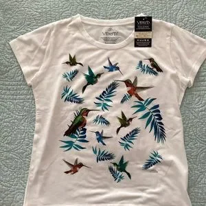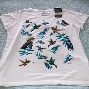 Adorable white with hummingbird design shirt sleeve T-shirt. Size S new with tag. Made in Ecuador. Very nice material
