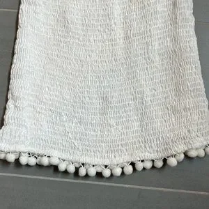 Smock material. Pom poms on bottom. White. Strapless