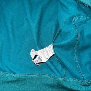 Teal blue satin zip up track suit jacket. Lightweight. Slightly cropped. Two pockets. Black line going down the sleeves. Excellent, like new condition.