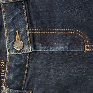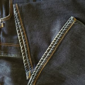 Classic darkwash bootcut jean in a petite length from Talbots; a staple in anyone's closet. 98% Cotton & 2% spandex for a bit stretch, flattering and comfortable. Size 10 / 30. EUC, some slight feathering at knee, which was probably an international design detail, and some expected use wear at bottom of hems.
