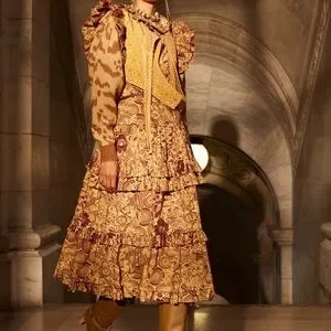 As featured in Look 33 of our Autumn/Winter 2022 Runway Show, the Elsie Dress is printed in a psychedelic collage of 17th century florals in yellow and maroon. The print expands across this commanding dress, beginning at the ruffled collar and layered flutter sleeves, and down the multi-tiered skirt.