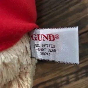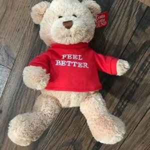 Little tan bear with a T-shirt that says 'Feel Better'. Great gift or great to keep around for those days when loved ones need a little boost to get better quickly. The price tag is no longer showing, but the manufacturer tag is attached. The bear is about 1 foot long.